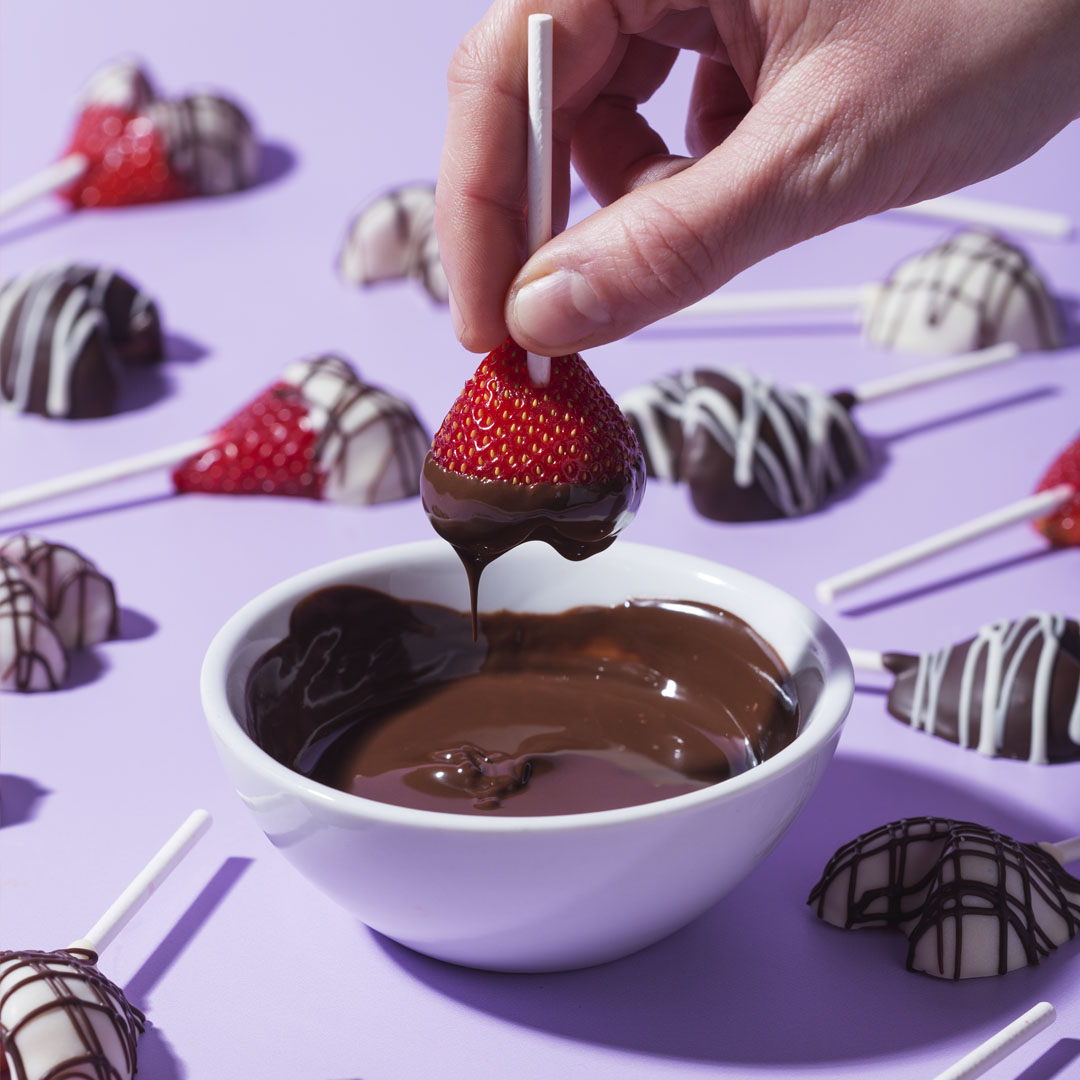 - Insert a sucker stick into the bottom of each strawberry half, dabbing away any juice with a paper towel.