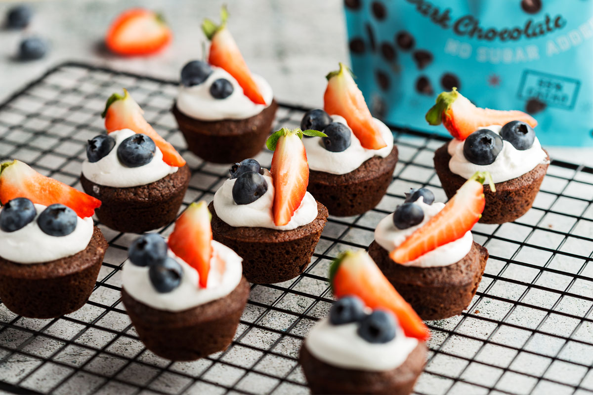 - Top each cooled brownie bite with a small amount of whipped cream, sliced strawberries, and blueberries.