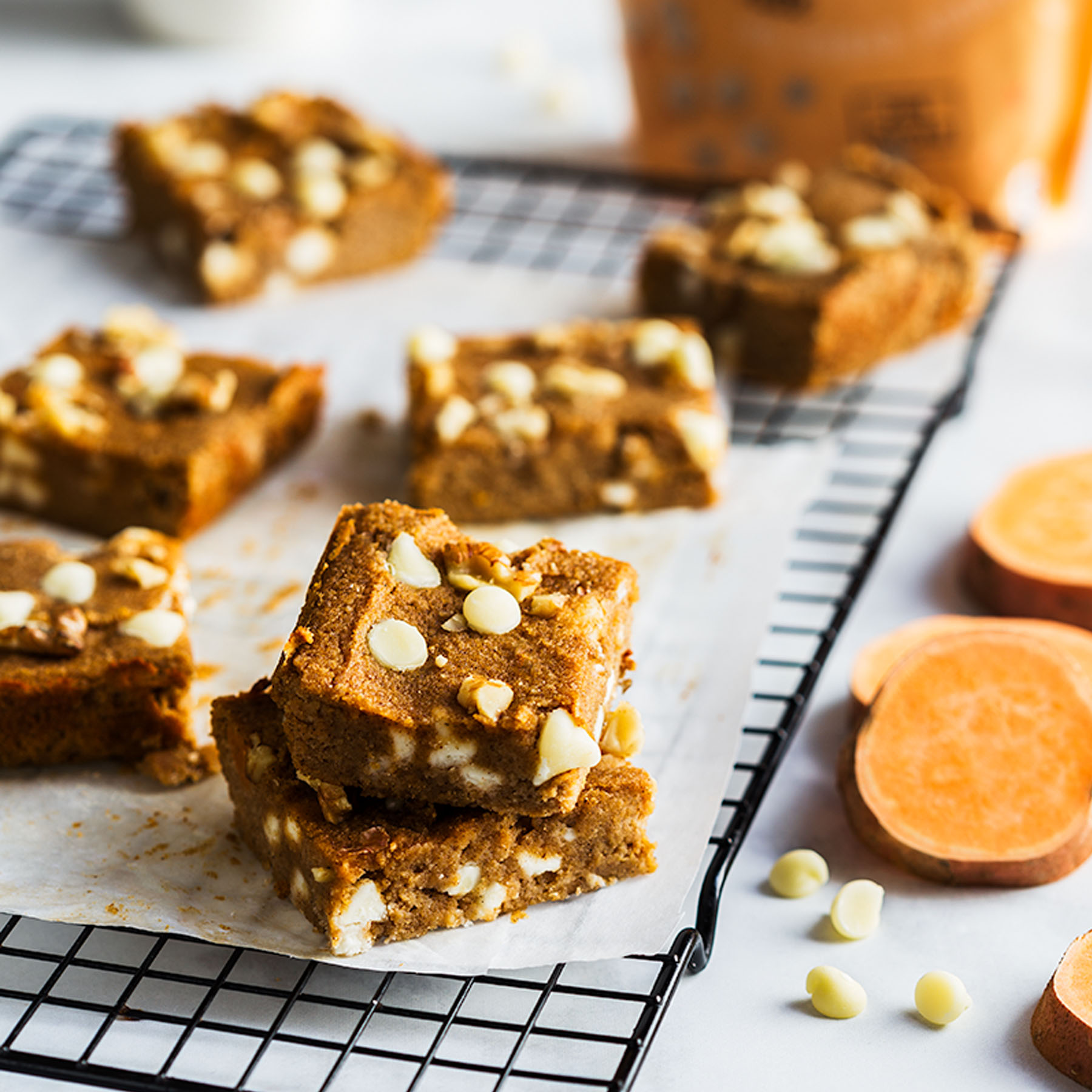 Bake Believe’s No Sugar Added Walnut White Chip Sweet Potato Blondies (Gluten Free)