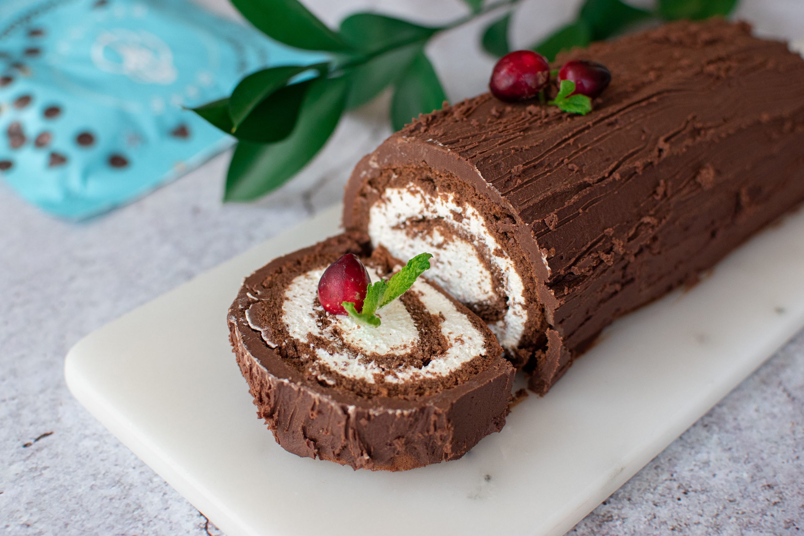 - Spread frosting on top of yule log then use the tip of a fork to make a tree bark pattern lengthwise. Top with cranberries and mint leaves. Enjoy.