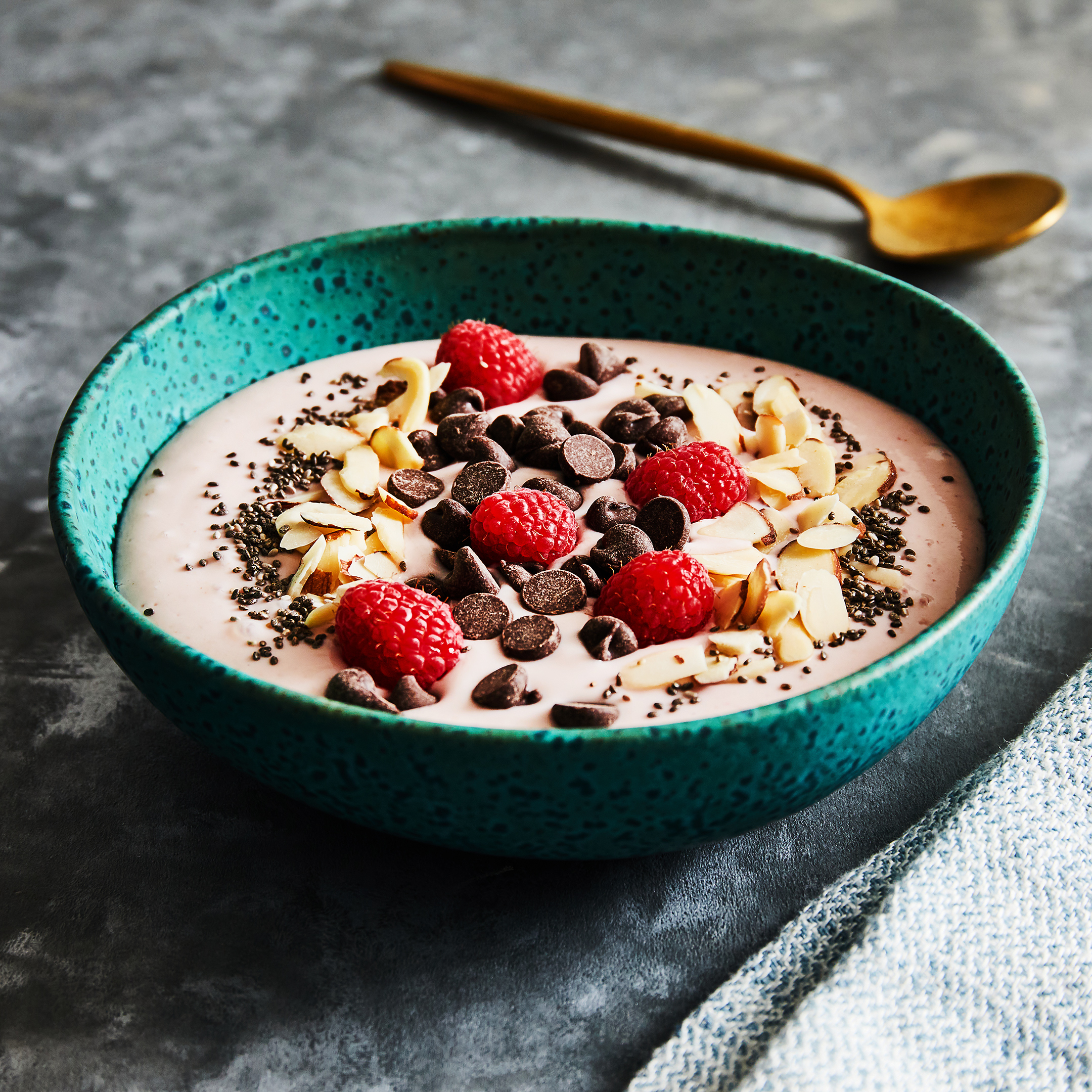 - Pour into a bowl. Top with chocolate chips, raspberries, almonds and chia seeds. Serve immediately and enjoy!
